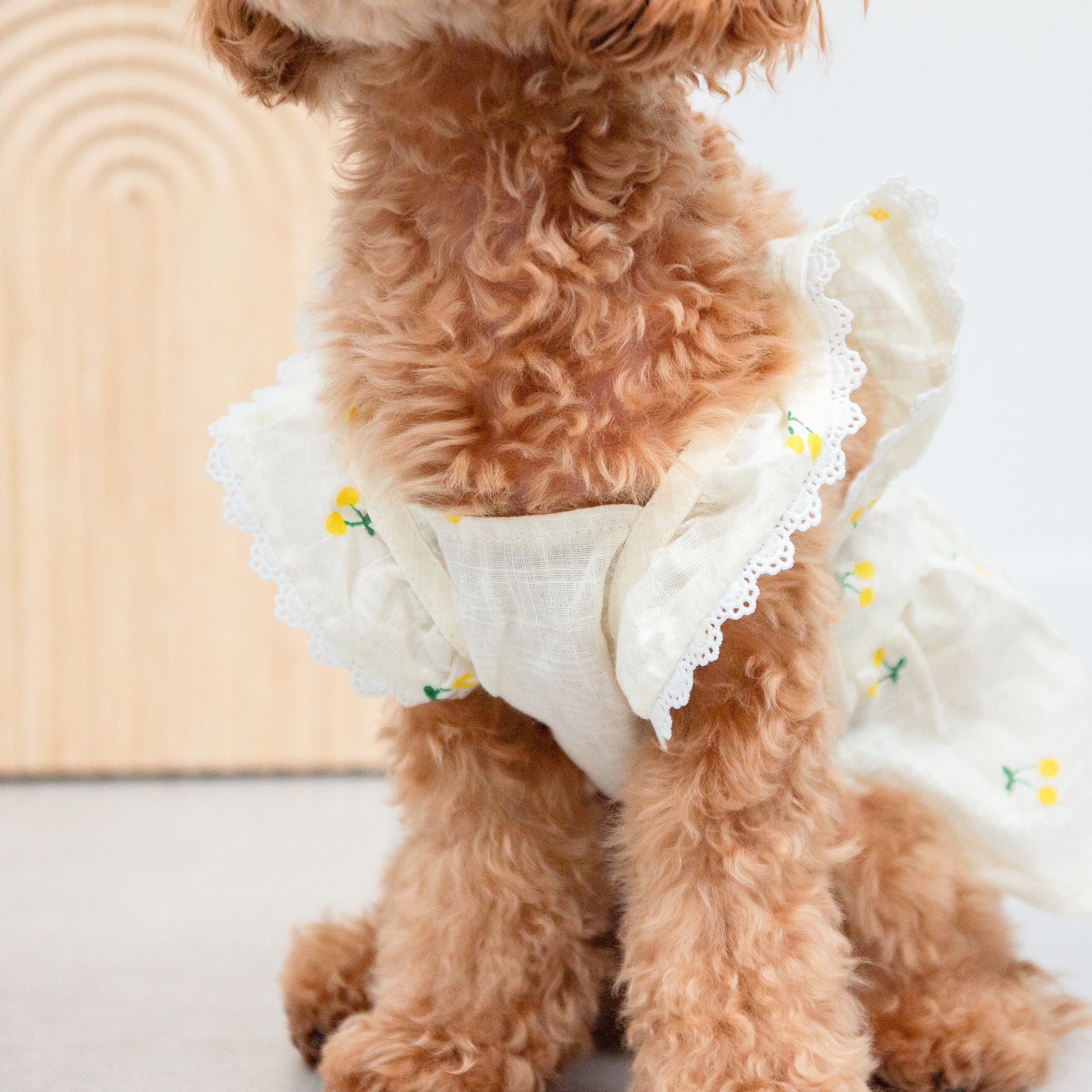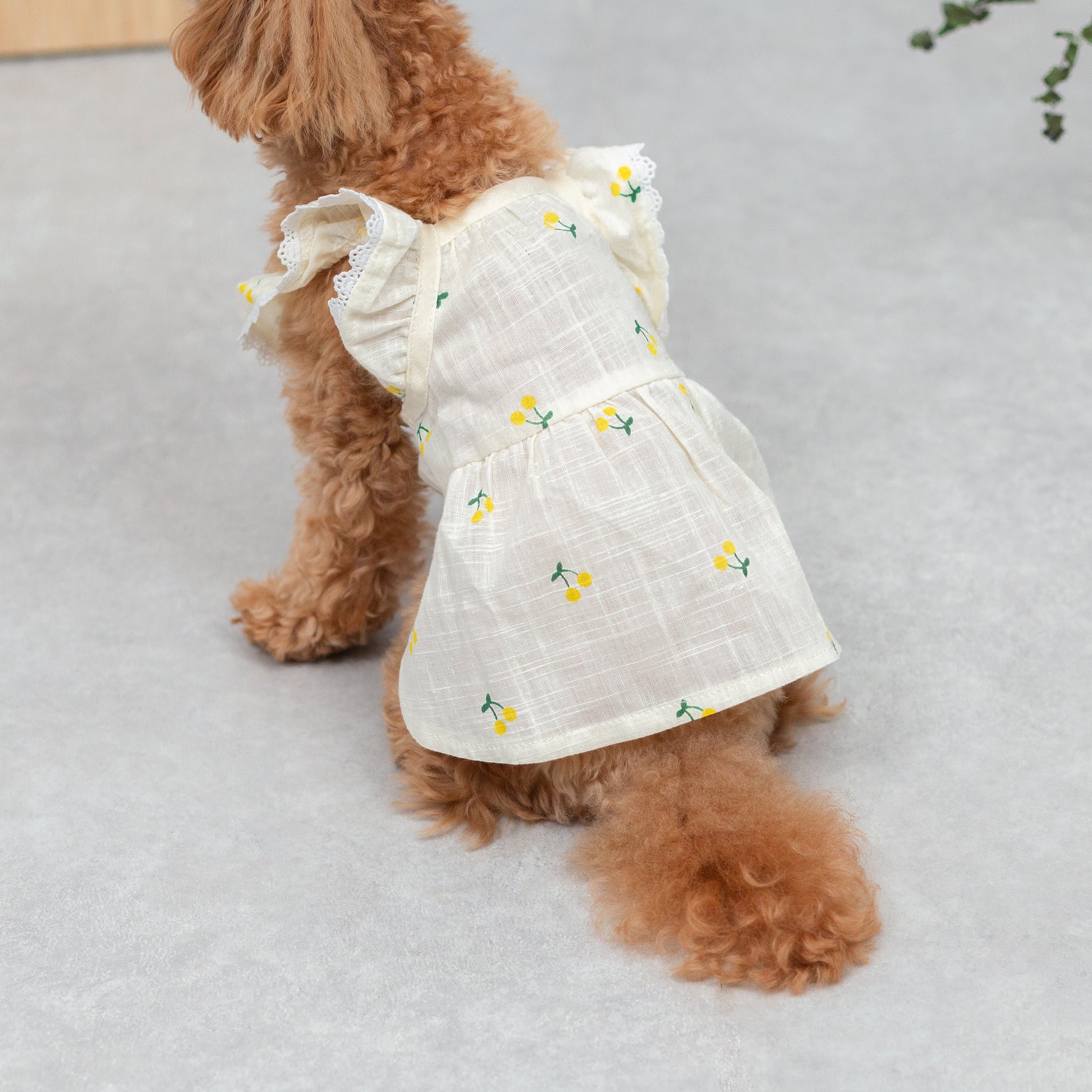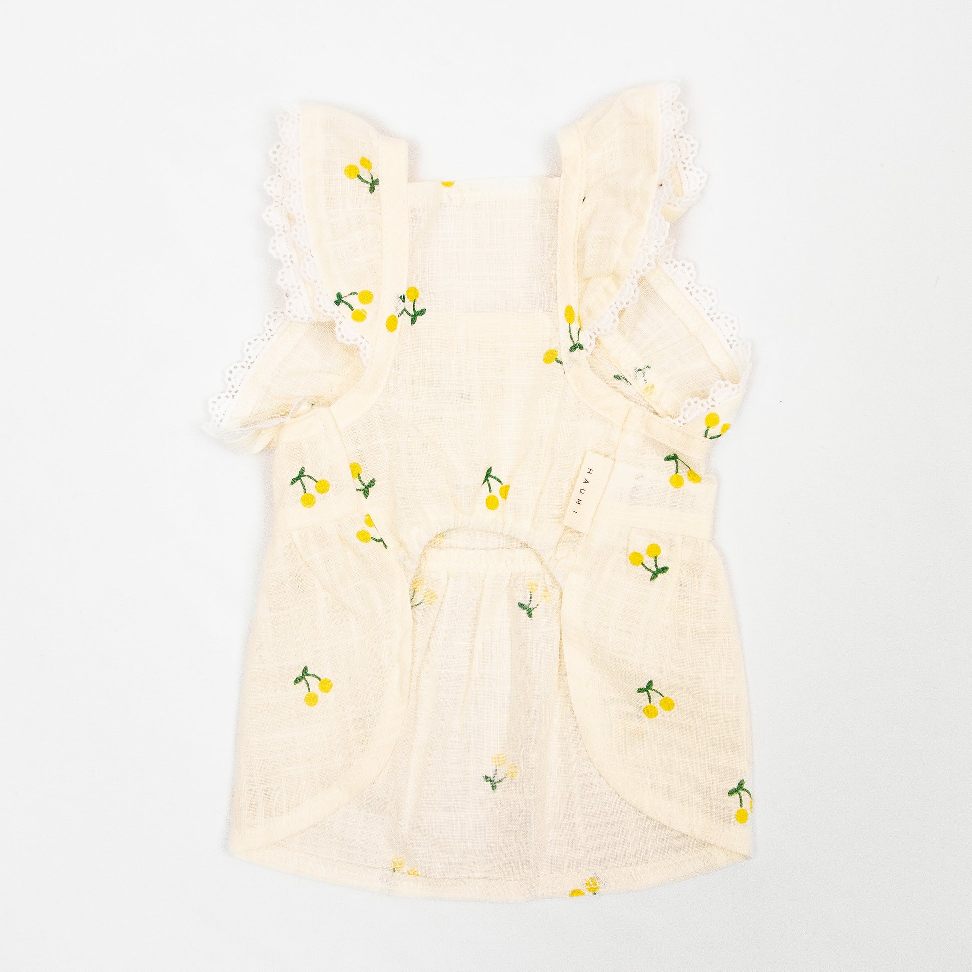 かわいいさくらんぼ柄のワンピース。 袖のフリルがよりかわいさを引き立てます。おでかけにぴったりのお洋服です。