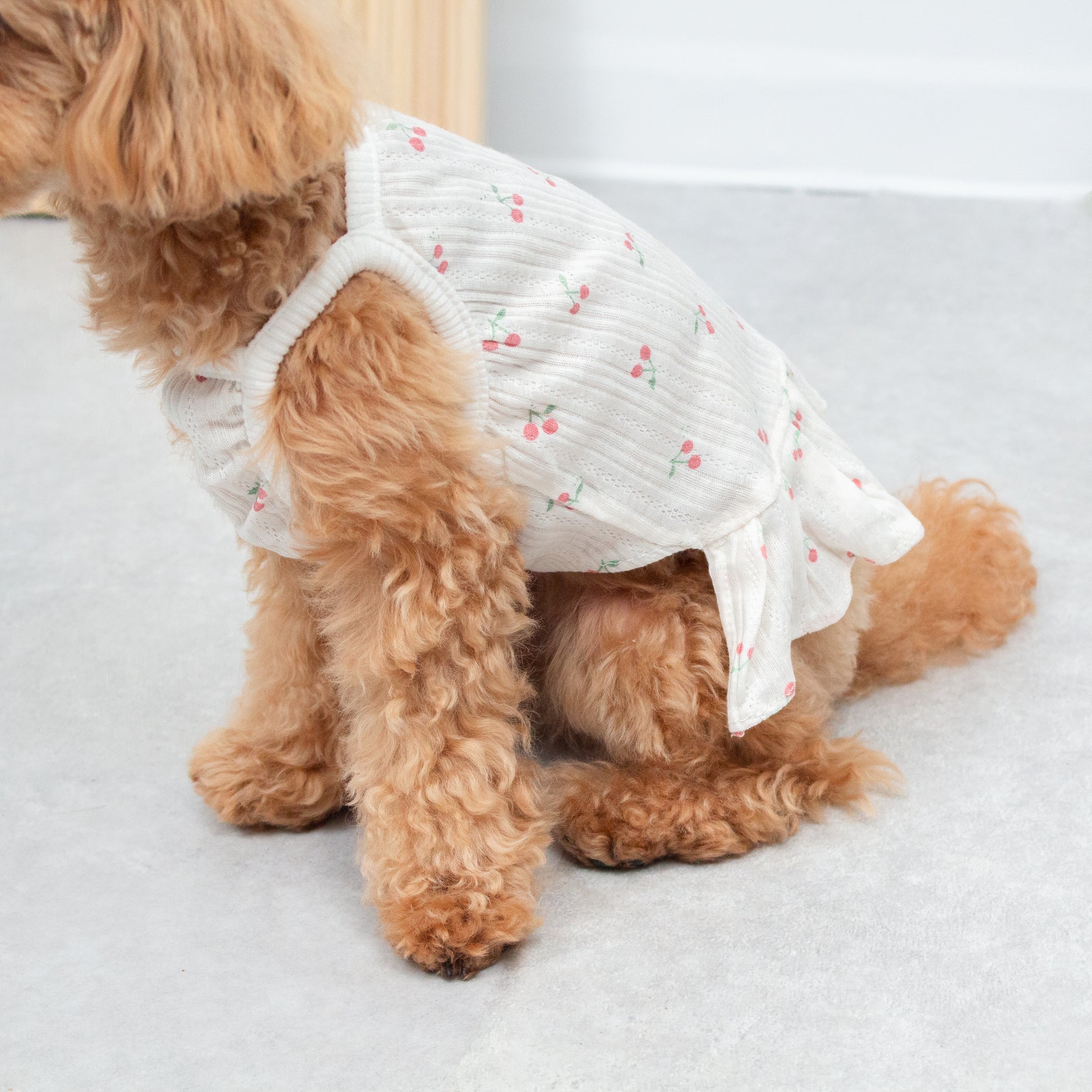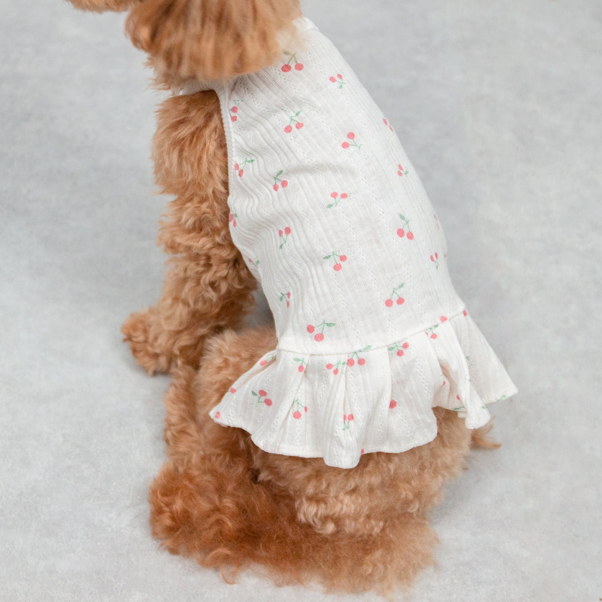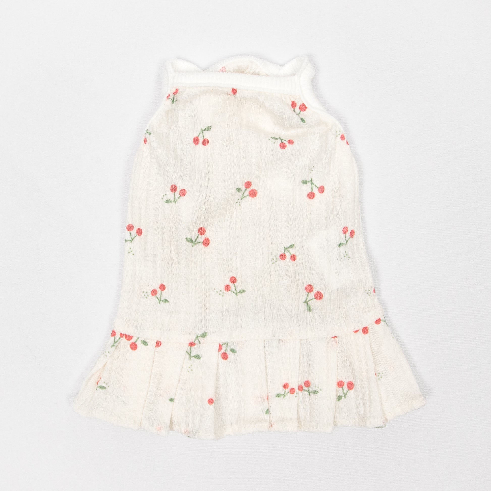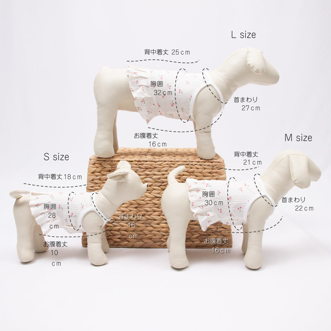 さっと着せられるさくらんぼ柄のキャミソールワンピです。 暑い夏でもお散歩中はわんちゃんの肌を守るために1枚着ておくと安心です。