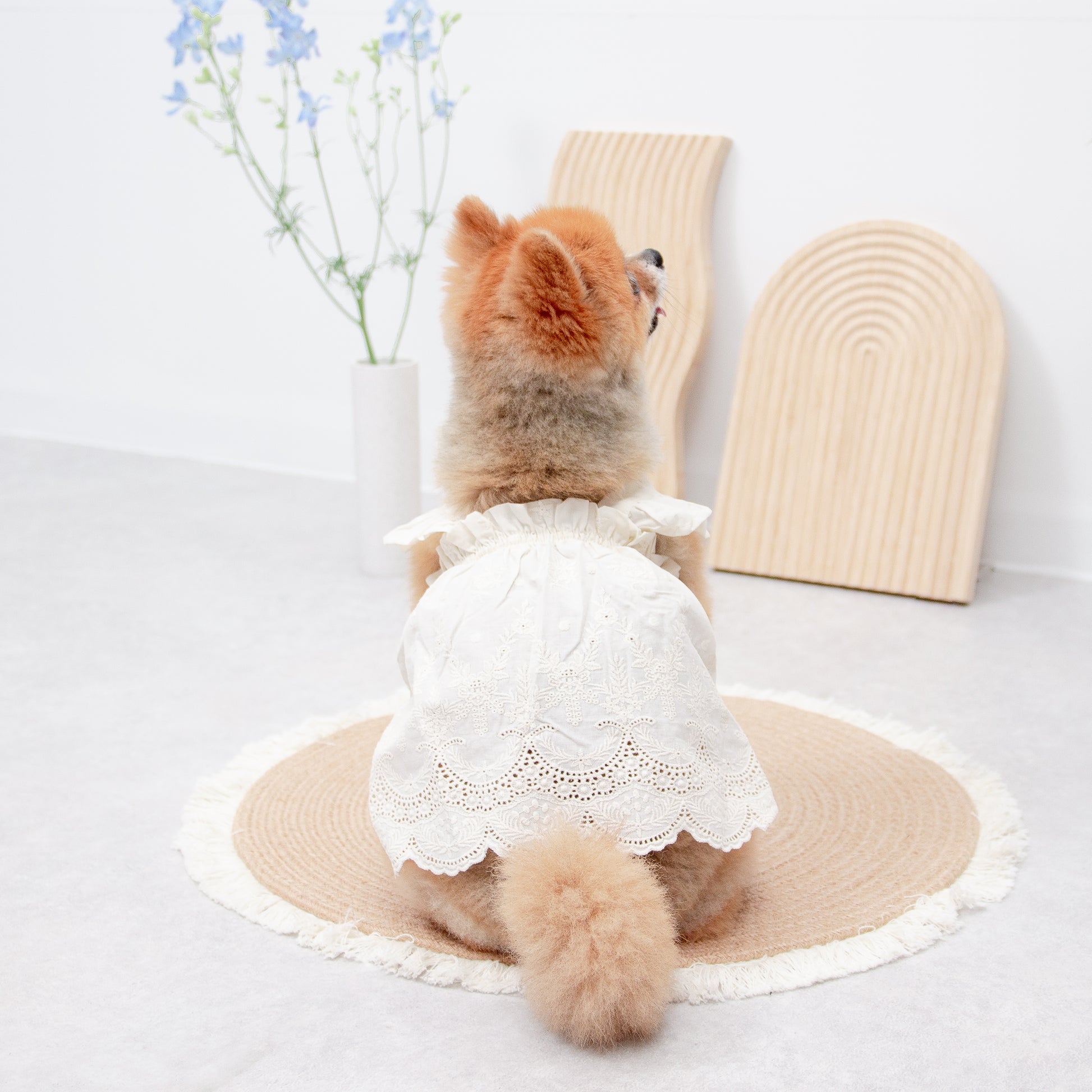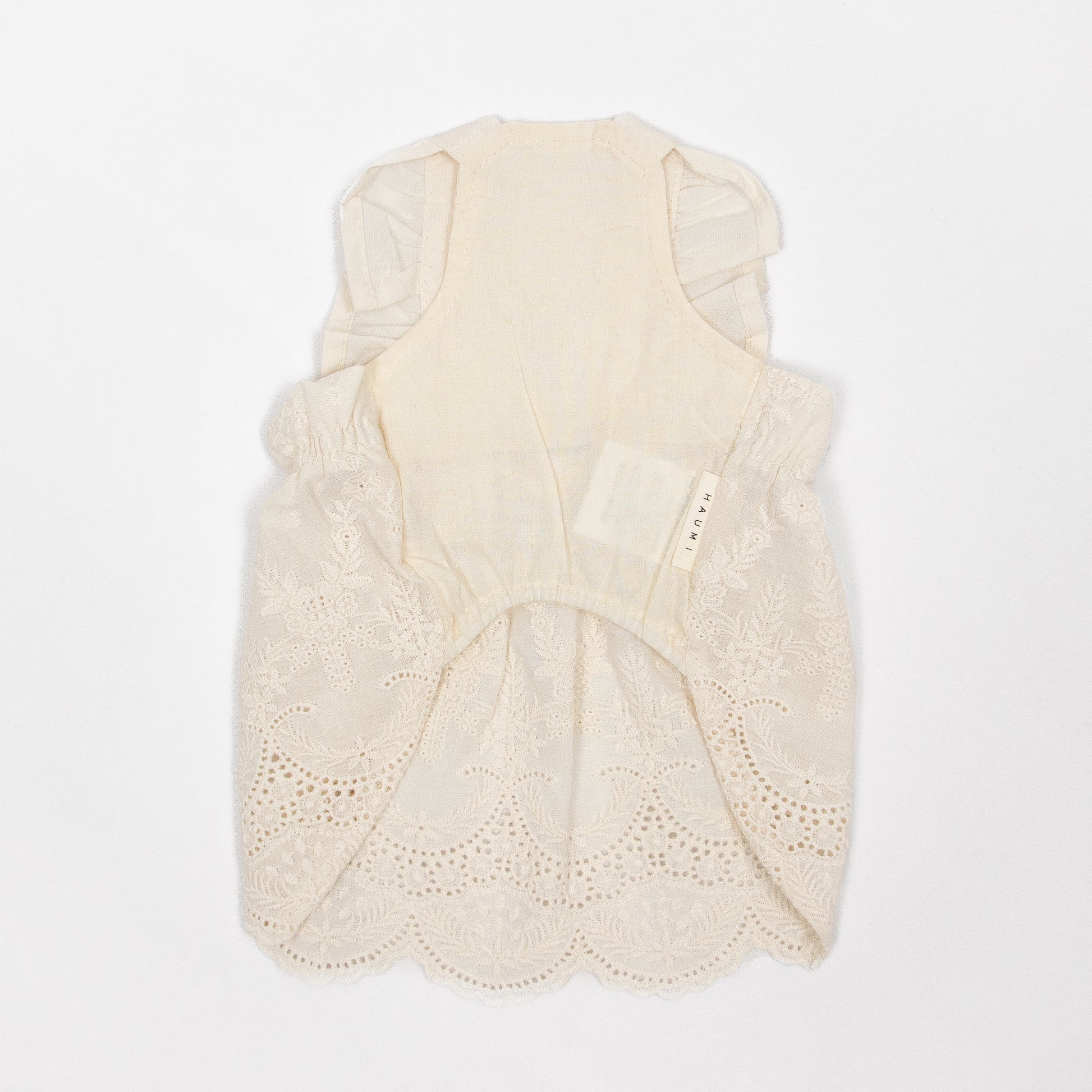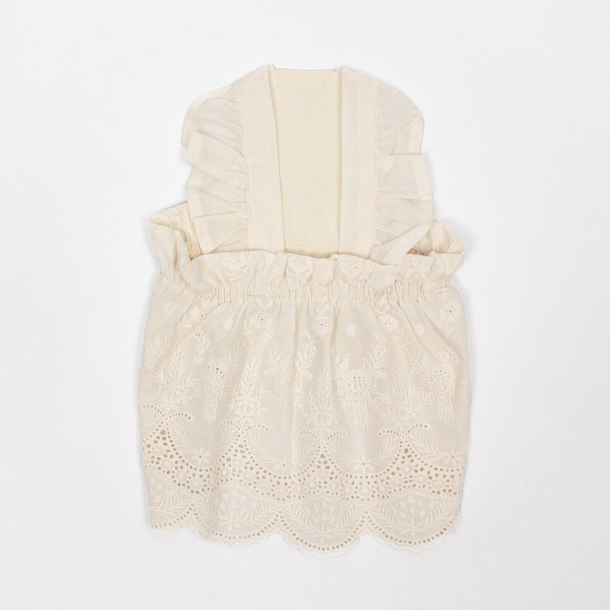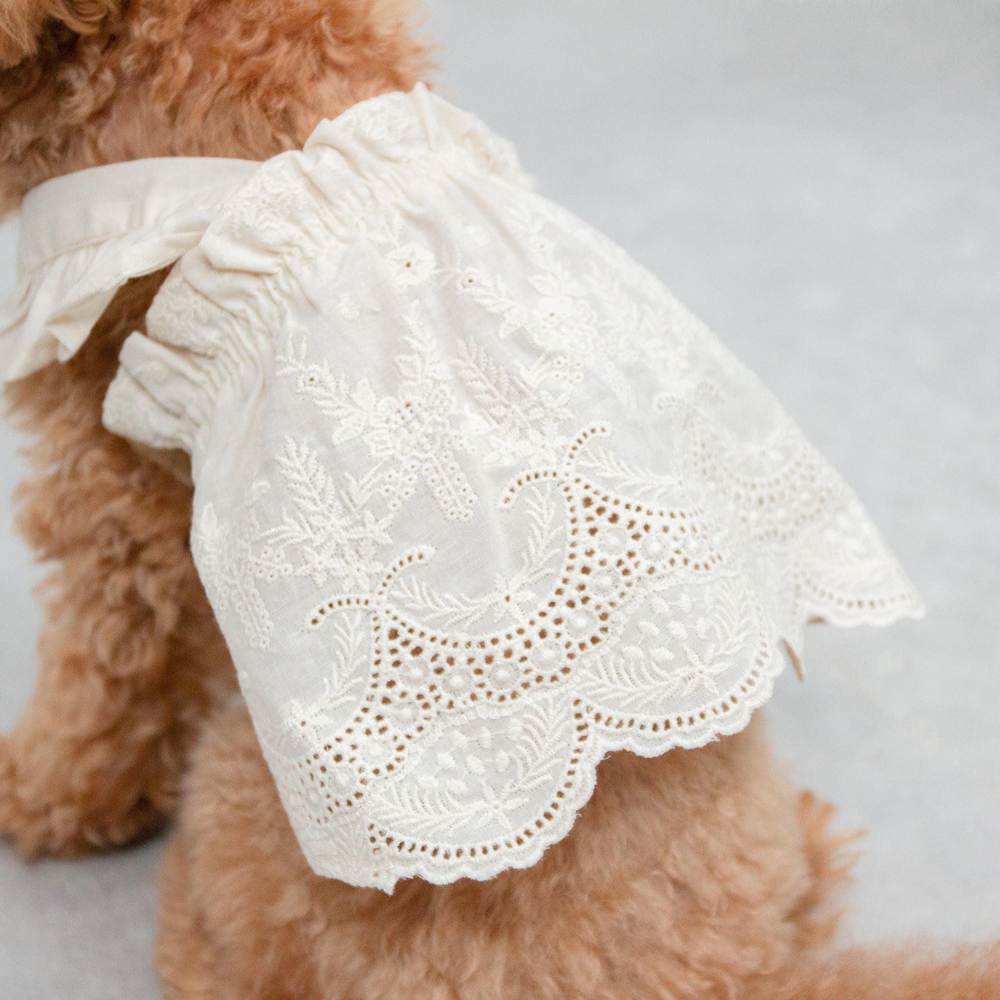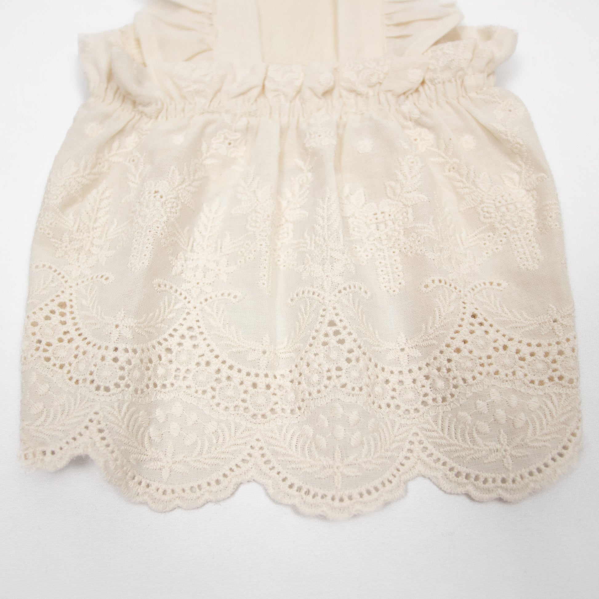 肩のフリルとスカートのレースがかわいらしいワンピースです。 生地はサラっとしており、着心地も抜群。細かなレース模様がとても上品です。