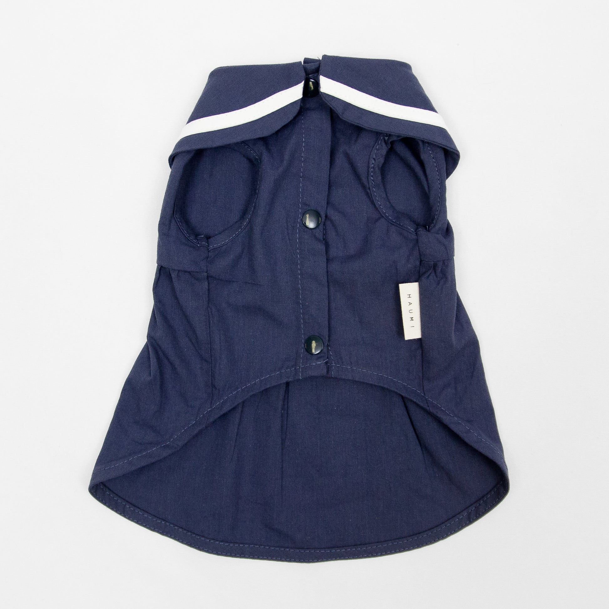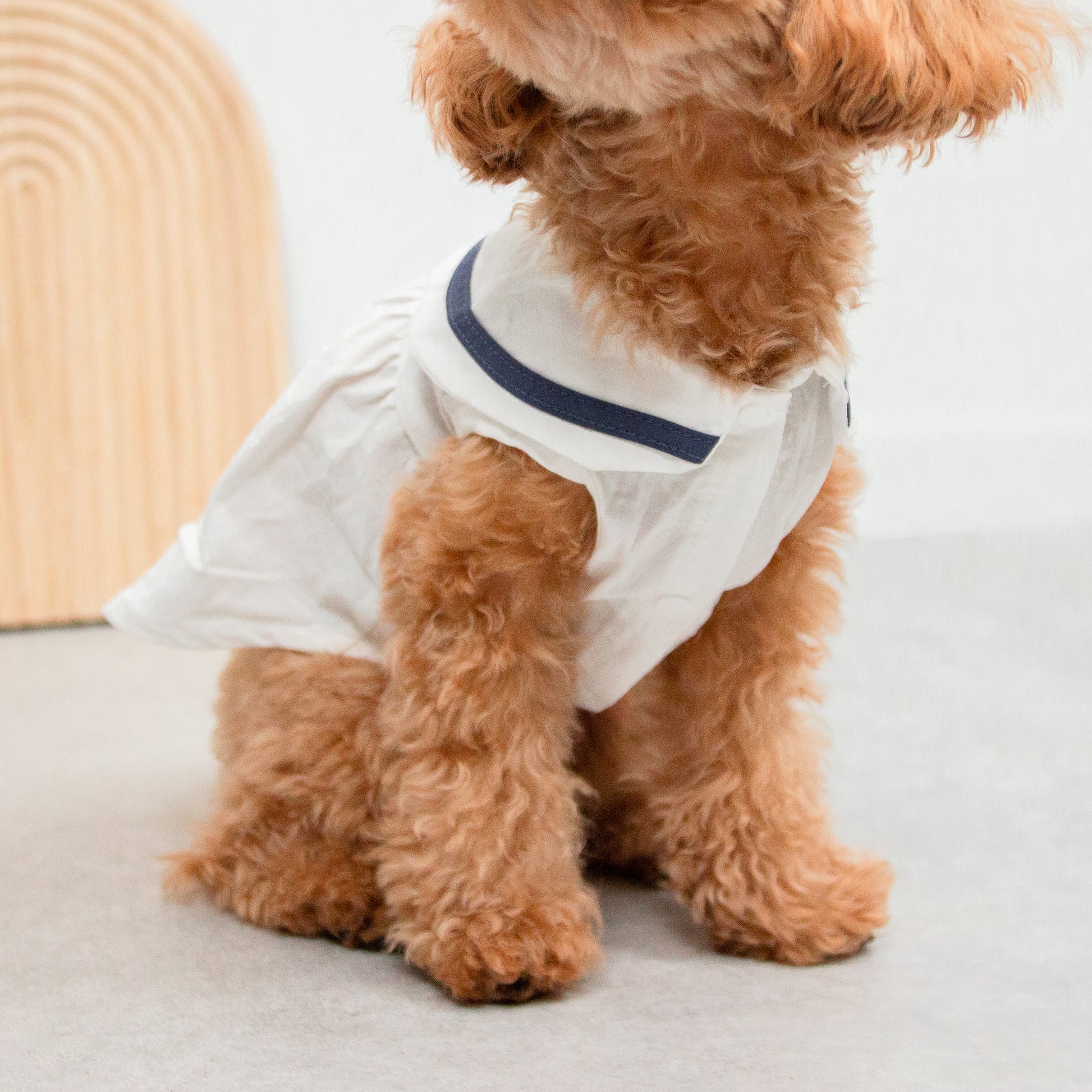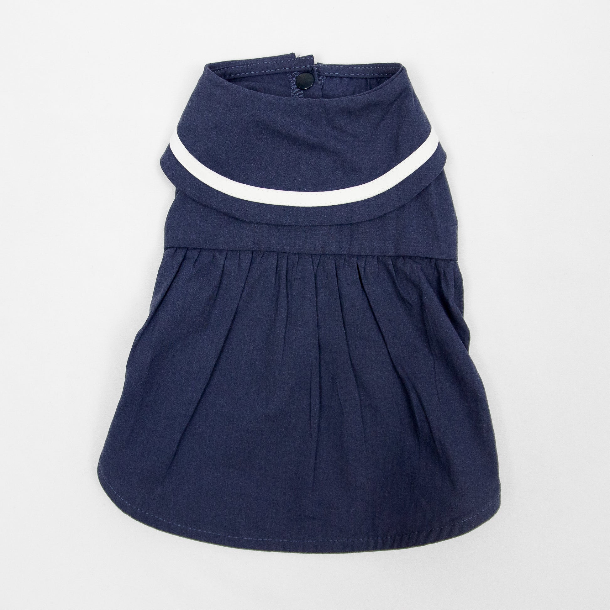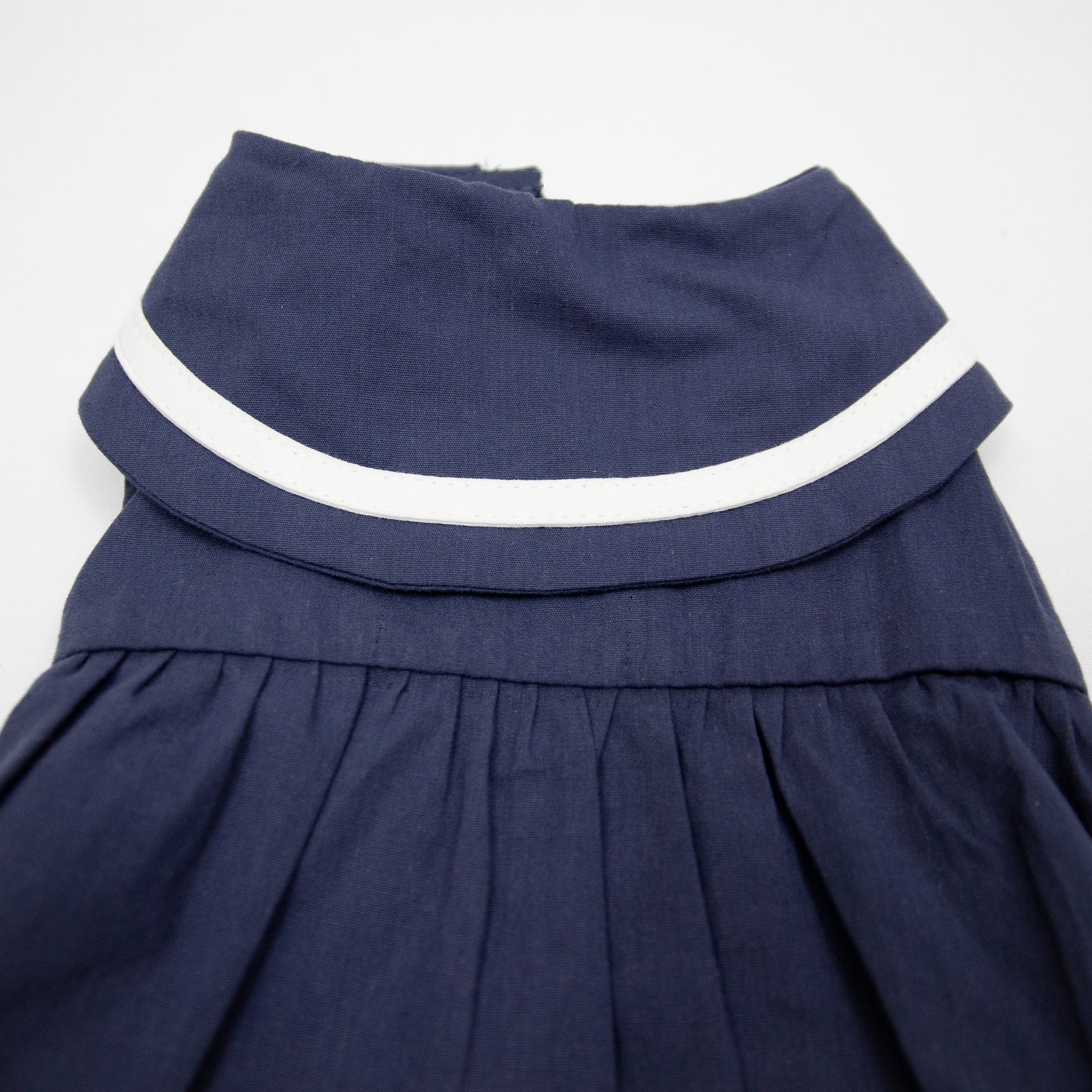 夏に最適なマリンカラーのワンピースです。 丸襟に入ったラインがアクセント。脇下から膨らむように作られたワンピースの形も とってもかわいい1着です。