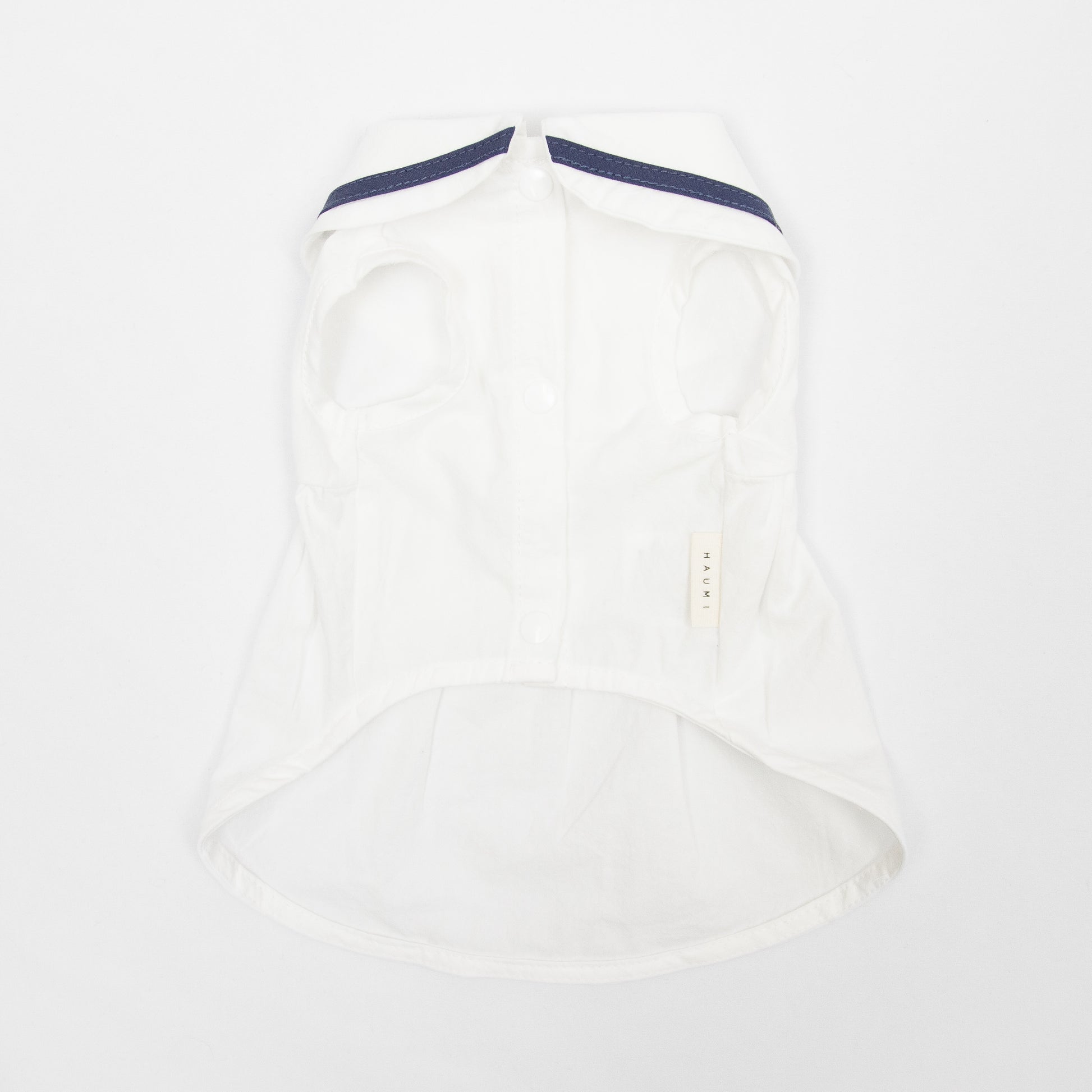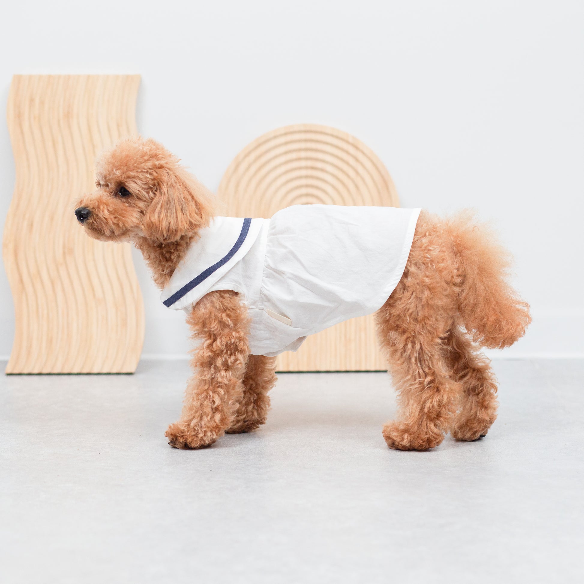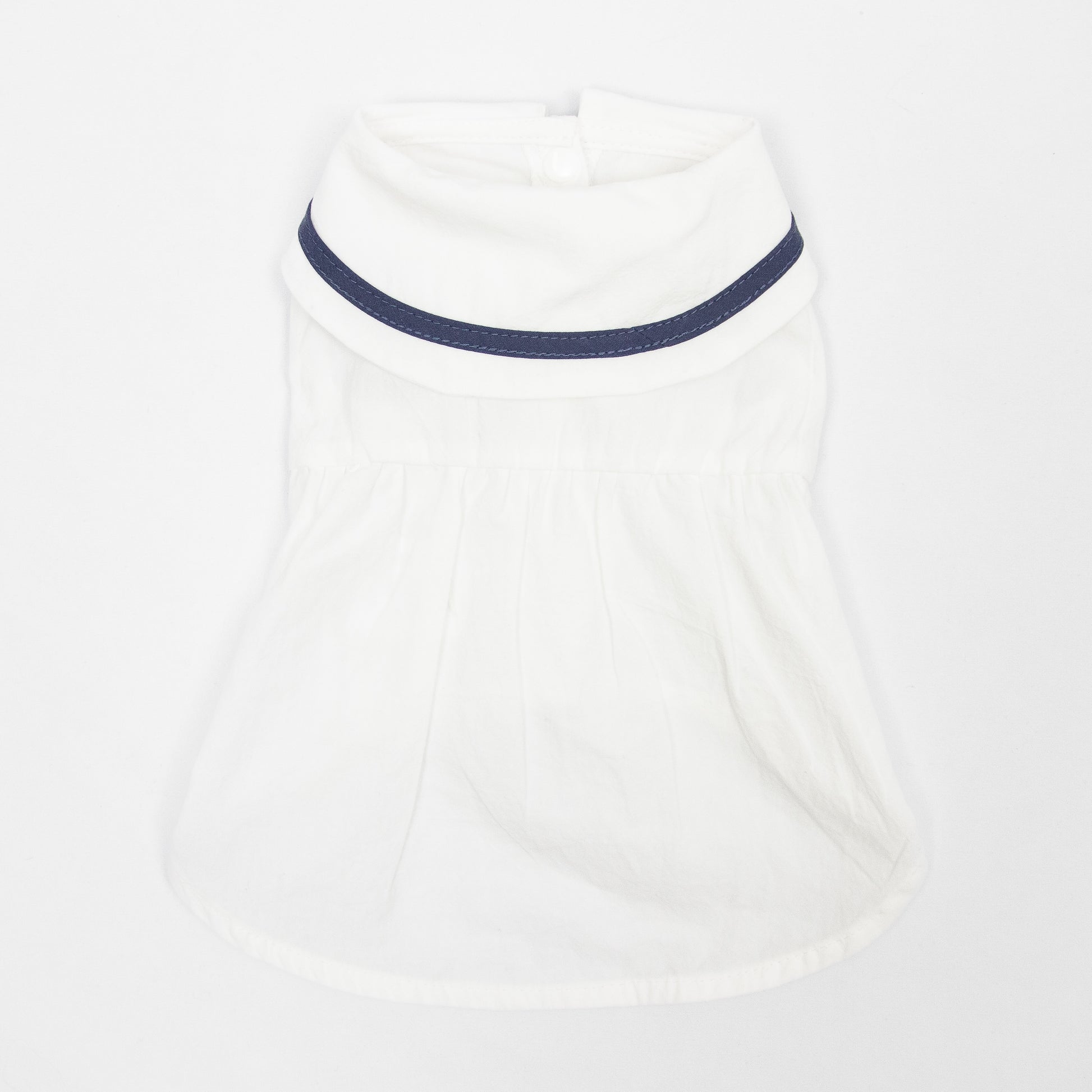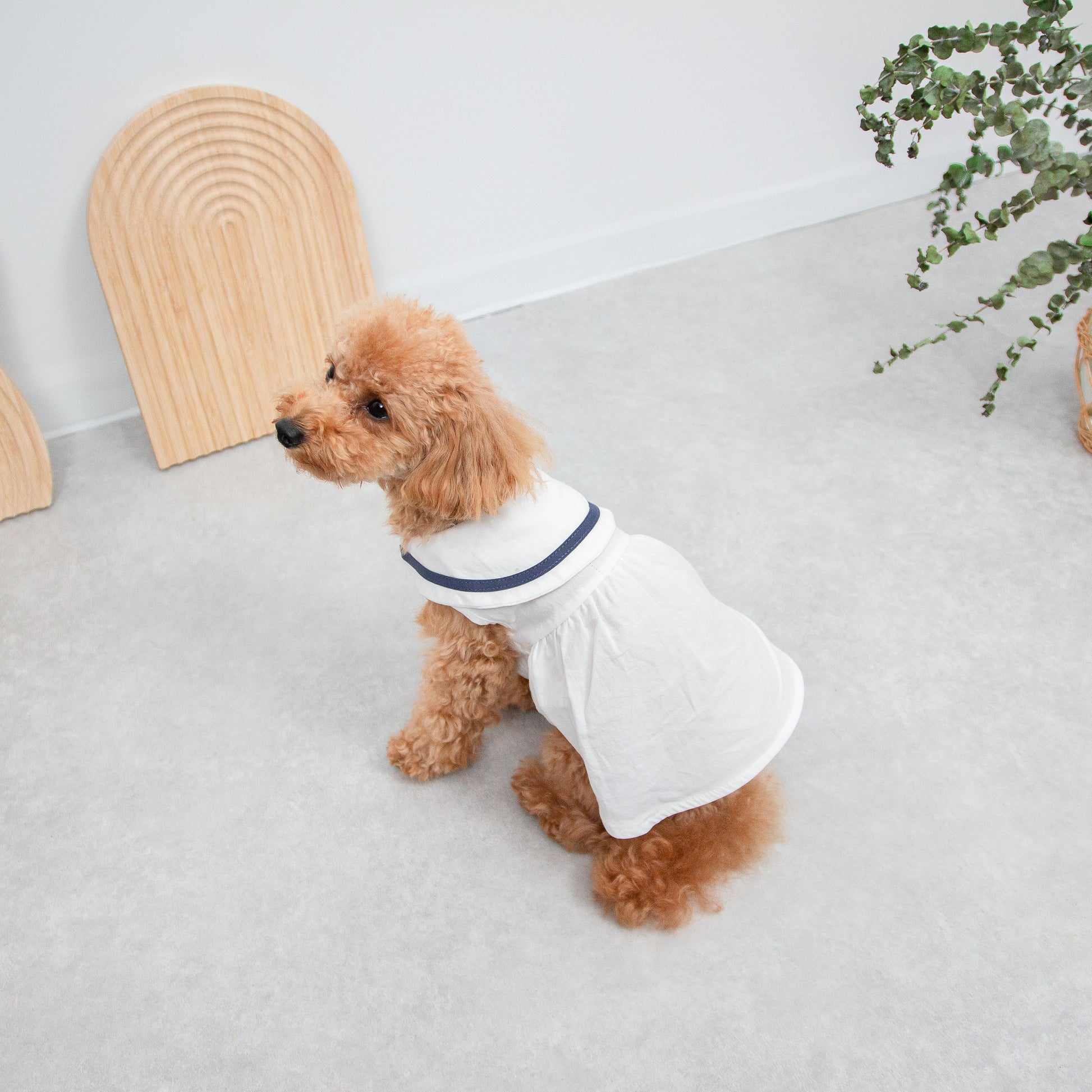 夏に最適なマリンカラーのワンピースです。 丸襟に入ったラインがアクセント。脇下から膨らむように作られたワンピースの形も とってもかわいい1着です。