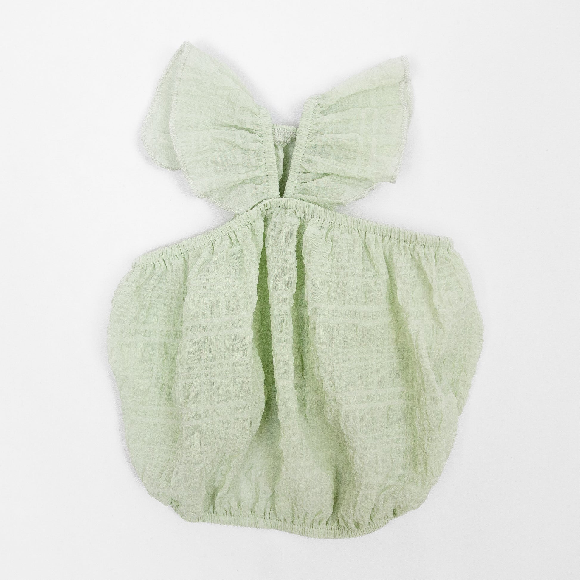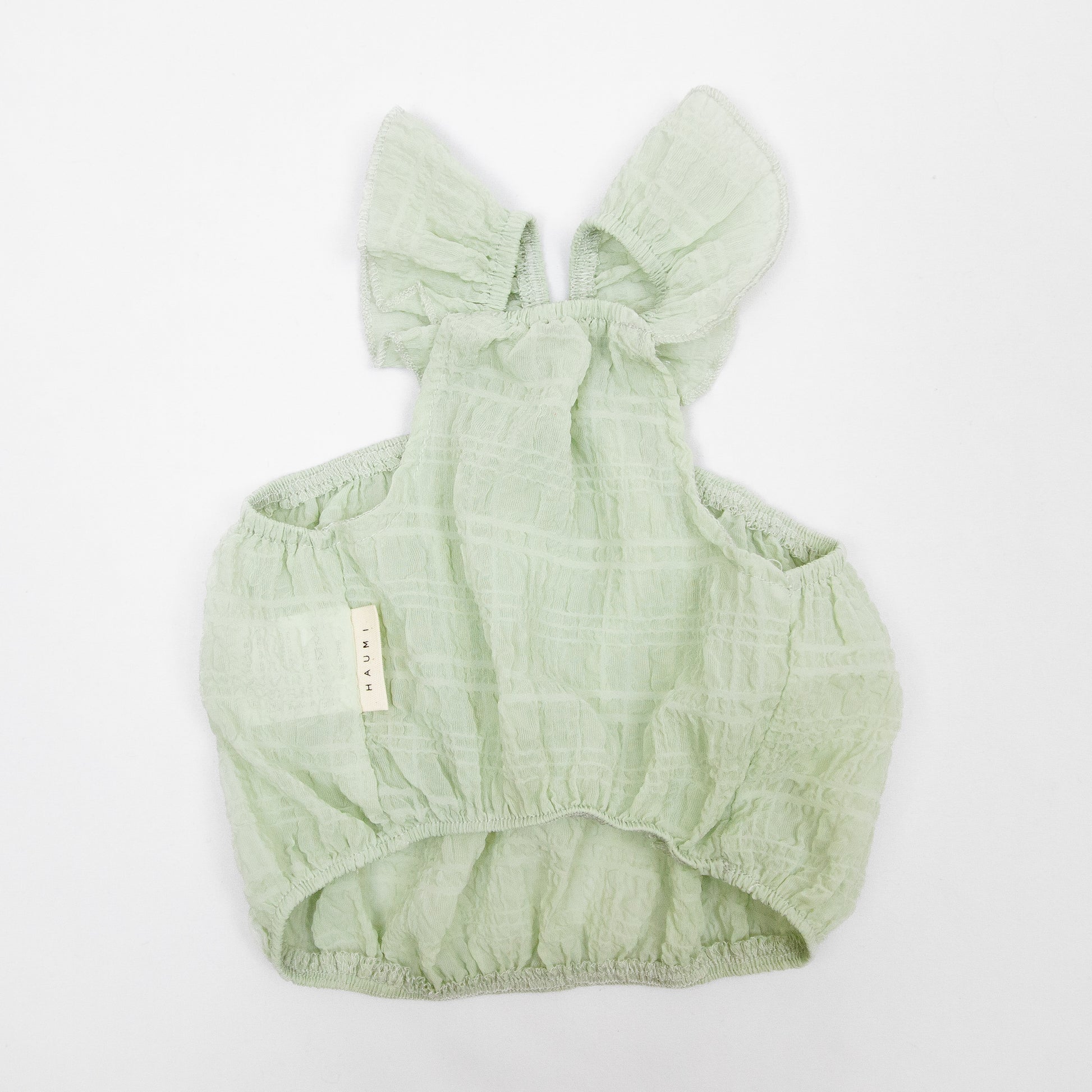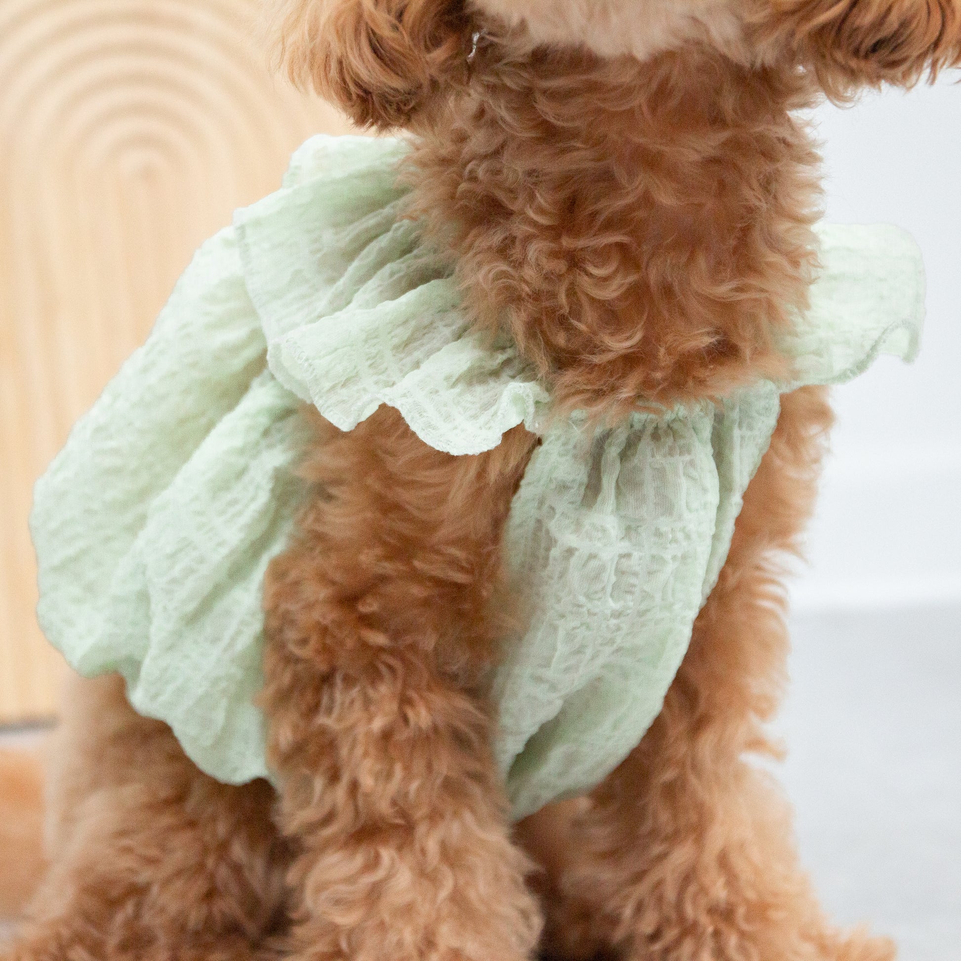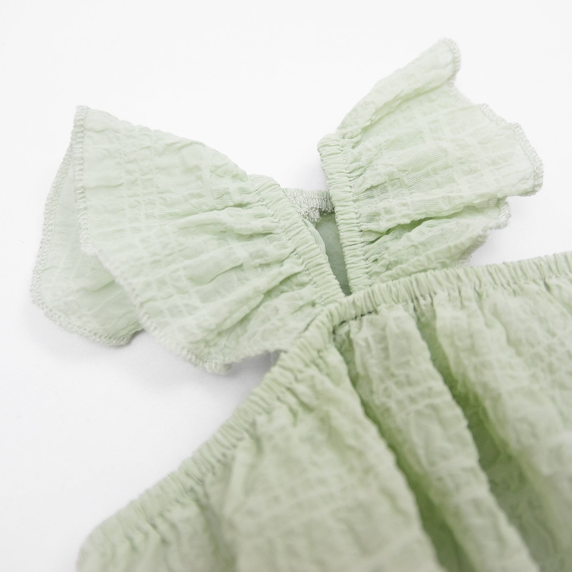 夏のおしゃれに1着は持っておきたいフリルワンピースです。 くすみ感のあるグリーンで、飽きがこないシンプルで上品なワンピース。 速乾性に優れており、すぐに乾くのもうれしいポイントです。